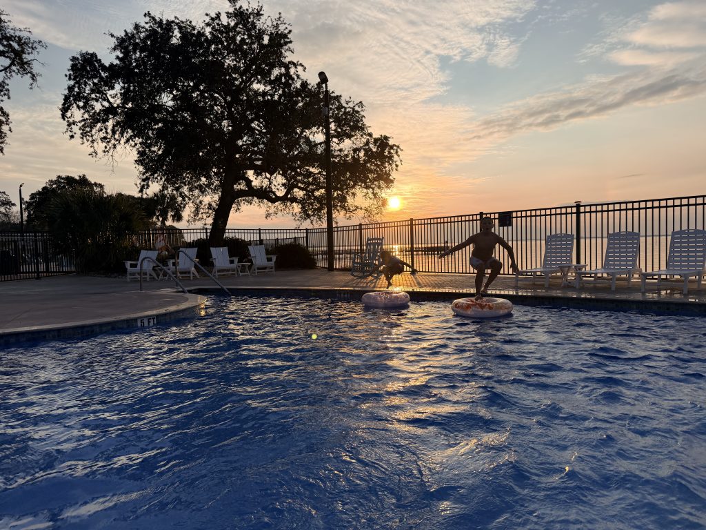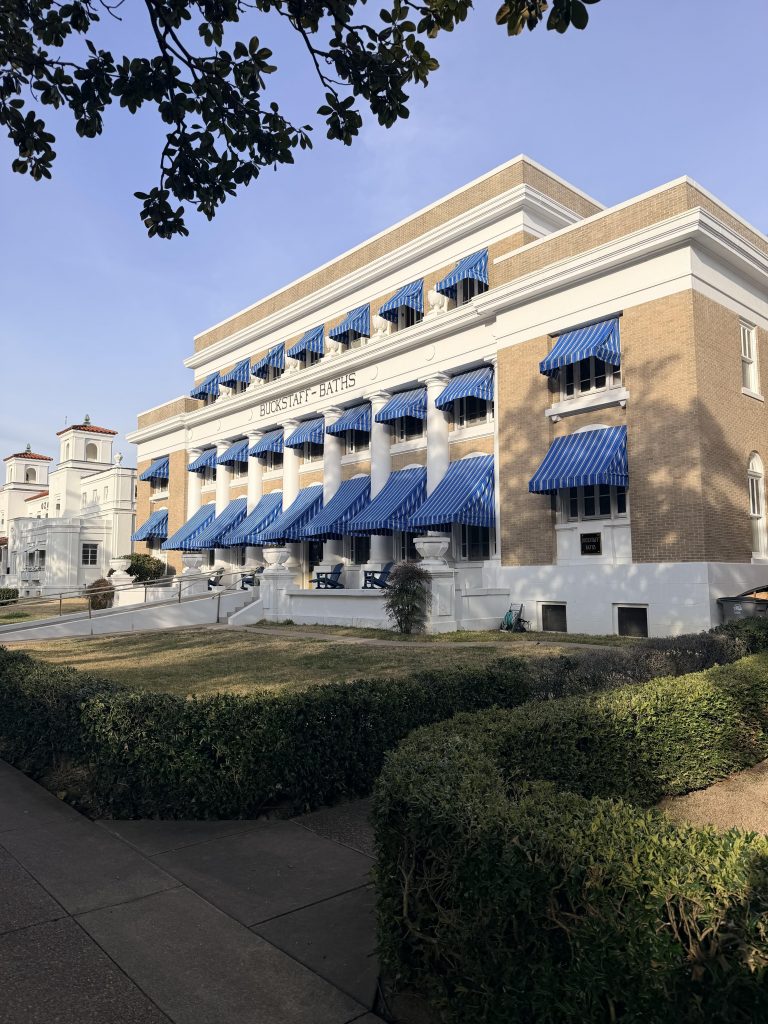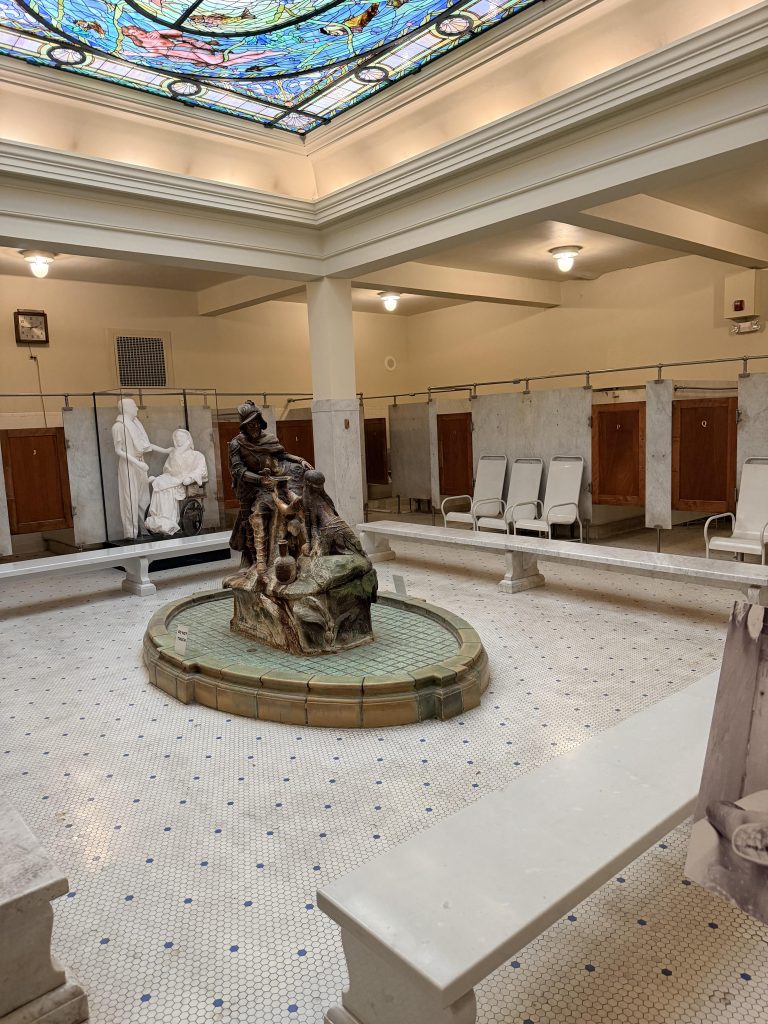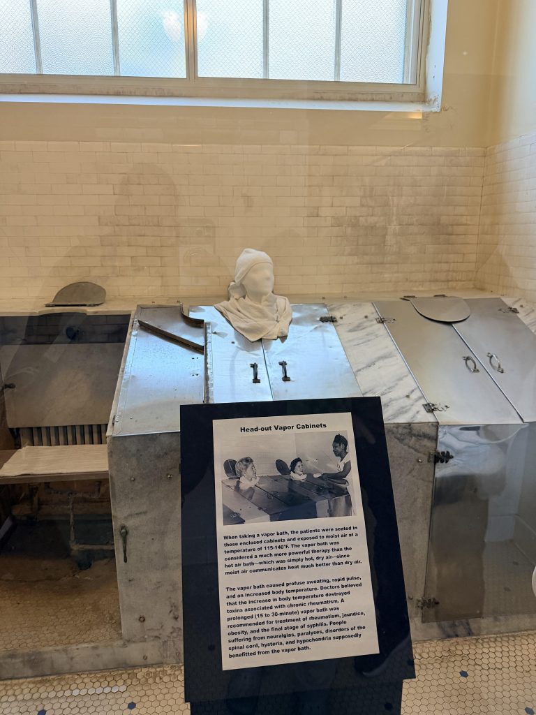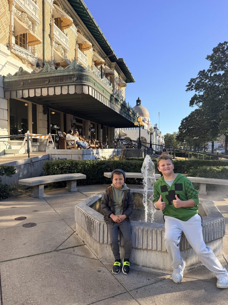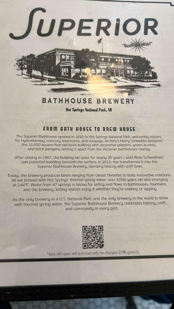 We are at Hot Springs National Park for a 5-day stay. The main thing we did here was go to the famous bathhouse row where they put you in bath tubs filled with hot spring water. In the past, it was popular because they thought it healed everything; modern medicine might be better now, but it was still really nice to relax in the tub. My dad and I went because the age limit was 10, so Eli sadly could not go. When we first got there, they told us to change, and we put on our swimsuits and then they took us to the bath where we soaked for 20 minutes in the hot spring water. They took us to the sitz tub where they sprayed hot water down your back. Next was my favorite part, the vapor cabinet. Where they put you in this box and only your head was sticking out. Inside was hot vapor, and it felt great! Finally, they took us to a soft mat where we laid on a sheet, and they put hot wet towels on you. We lay there for a couple of minutes; we were like warm burritos! Then we switched out, and my mom got to go by herself. It was really nice and relaxing to be in the hot spring water, and I definitely enjoyed it!